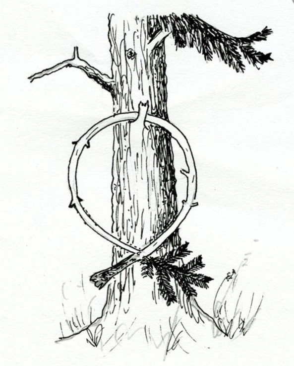 dává pokyn "Počkej zde na mne!". Používá se ku příkladu v tom případě, jestliže jsme si dali s někým sraz na určitém místě a byli jsme nuceni se na čas vzdálit, anebo i v jiných podobných případech. Jsou to dva zálomky velikosti paže, neostrouhané, položené křížem spodní stranou nahoru.